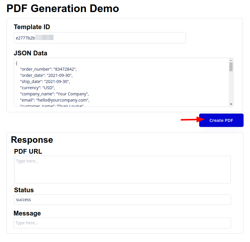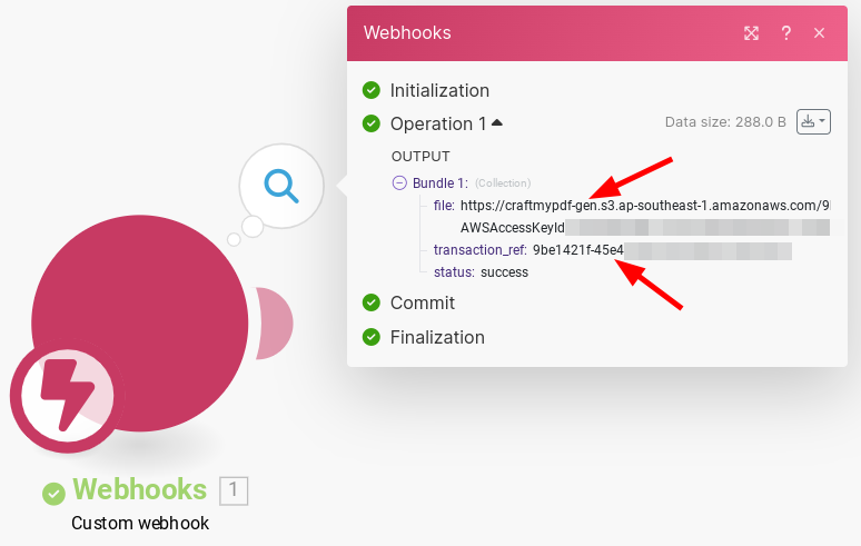 The following is the result that the trigger received from CraftMyPDF, including the PDF URL, transaction reference, and the status. You can now use the PDF URL for subsequent action such as sending an email to your user.