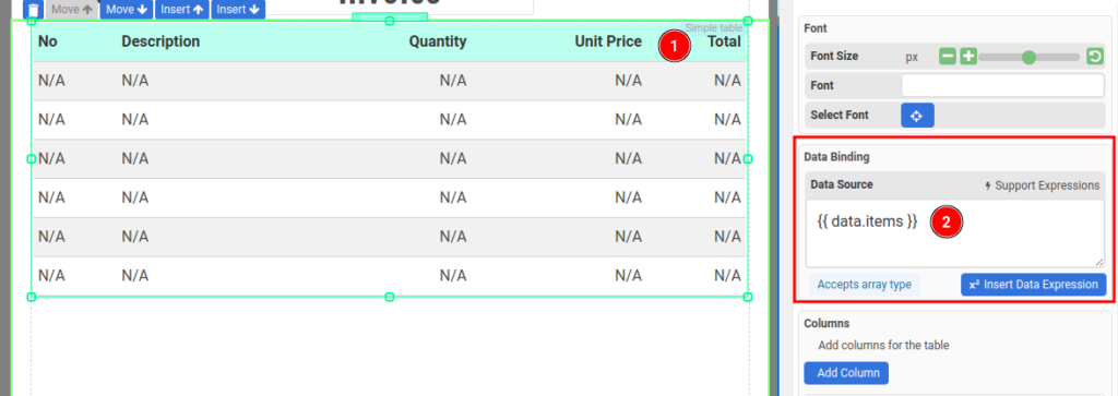 Then, add new columns to the Simple Table component. Click the button Add Columns in the Columns section in the property panel.