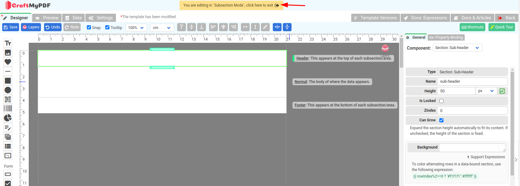 If you are in the Subsection Mode, click on the Orange bar on the upper section in the template editor to go back to the designer.