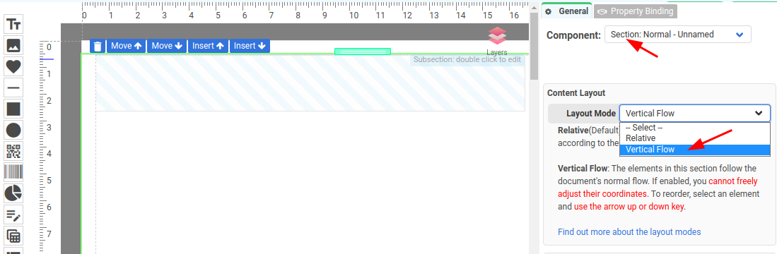 - Normal: This repeats the rows. Please make sure Data Binding property is enabled in the property panel.