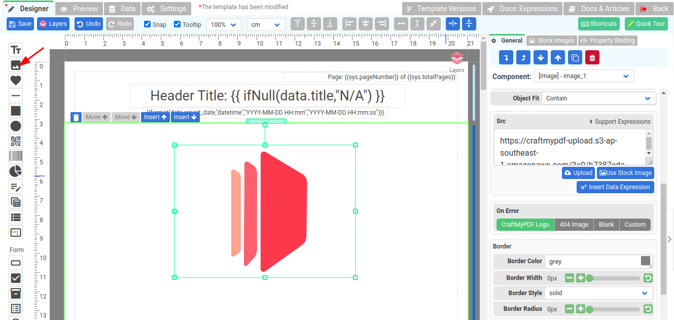 The Image component serves the purpose of displaying images within the PDF template. To add an Image component, simply locate it in the toolpanel and drag-and-drop it to the desired position within the template.