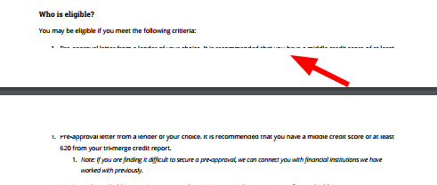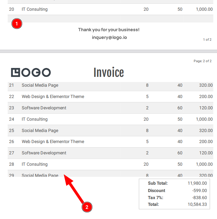 The following is a sample PDF and parts of it (1) are “stuck” between page 1 and page 2, causing the section not able to render the section completely(2).