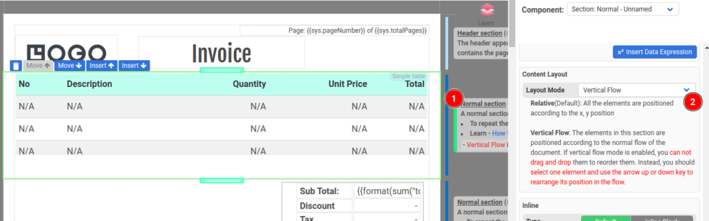 Vertical Layout Mode makes the elements in a section flow naturally. It is useful for components such as data-bound sections, simple tables, etc, especially if you have components or records that span across multiple pages.