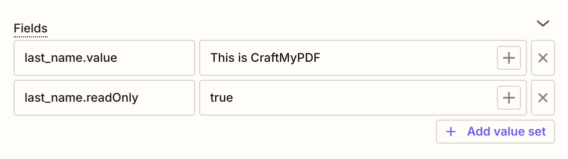 For example the field id is last_name, use the key last_name.value to fill the value and last_name.readOnly to make the field readOnly